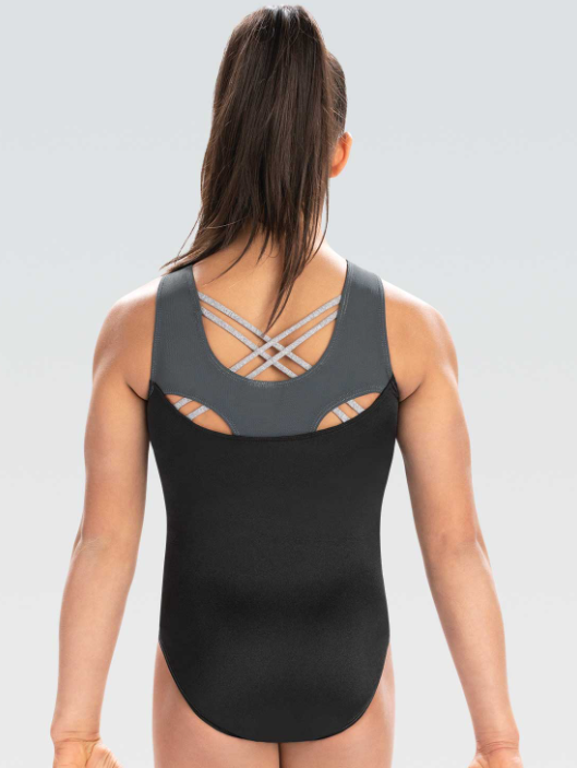 Schouders en bovenrug in houtskool techmesh met zilverkleurige heather spaghetti kruisbandjes